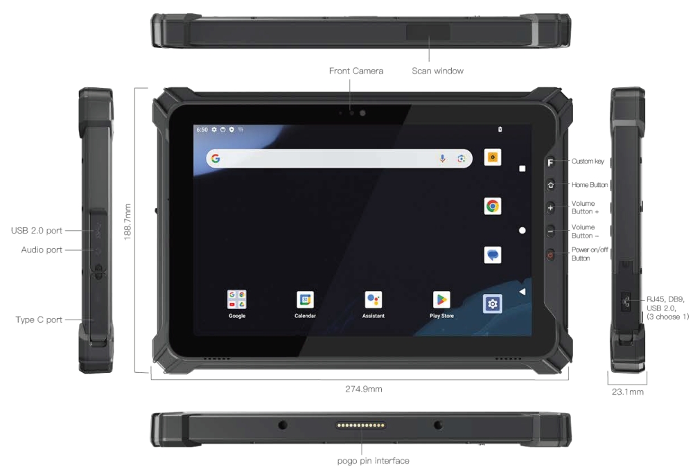 I/O | USB 2.0 Type-A x 1, USB Type-C x 1, SIM Card x 2, TF Card (Three in one card holder), 12-PIN Pogo Pin x 1, Φ3.5mm standard earphone jack x 1 |